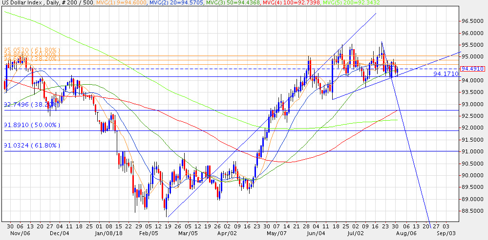 The confirmation point of the double top in the dollar index at 94.17 was tested today. While this level has contained the downside thus far, if it were to give way, the 95.53 double top (21-Jun and 28-Jun highs) would be confirmed.